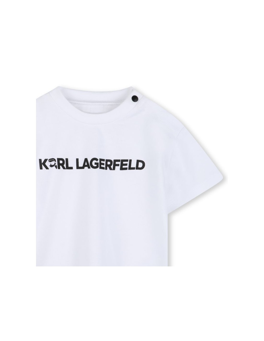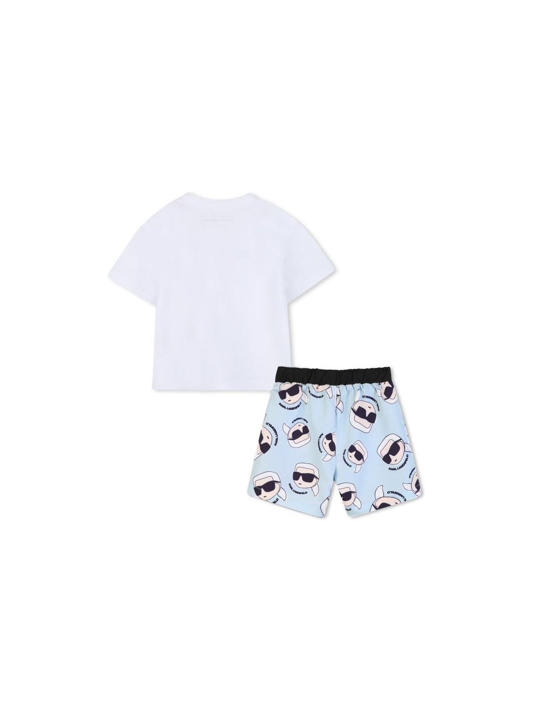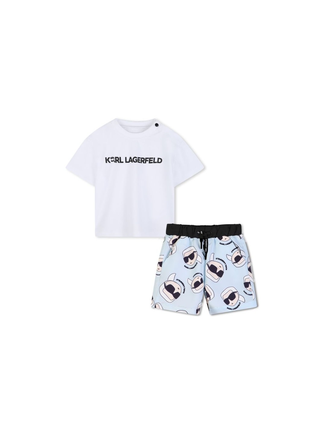 Descubra o mundo de estilo e conforto com este conjunto KARL LAGERFELD KIDS. Uma t-shirt de algodão orgânico, com fecho de botão no ombro e gola canelada, combina praticidade e elegância. Os calçoes de banho, completam o conjunto perfeito de verao.