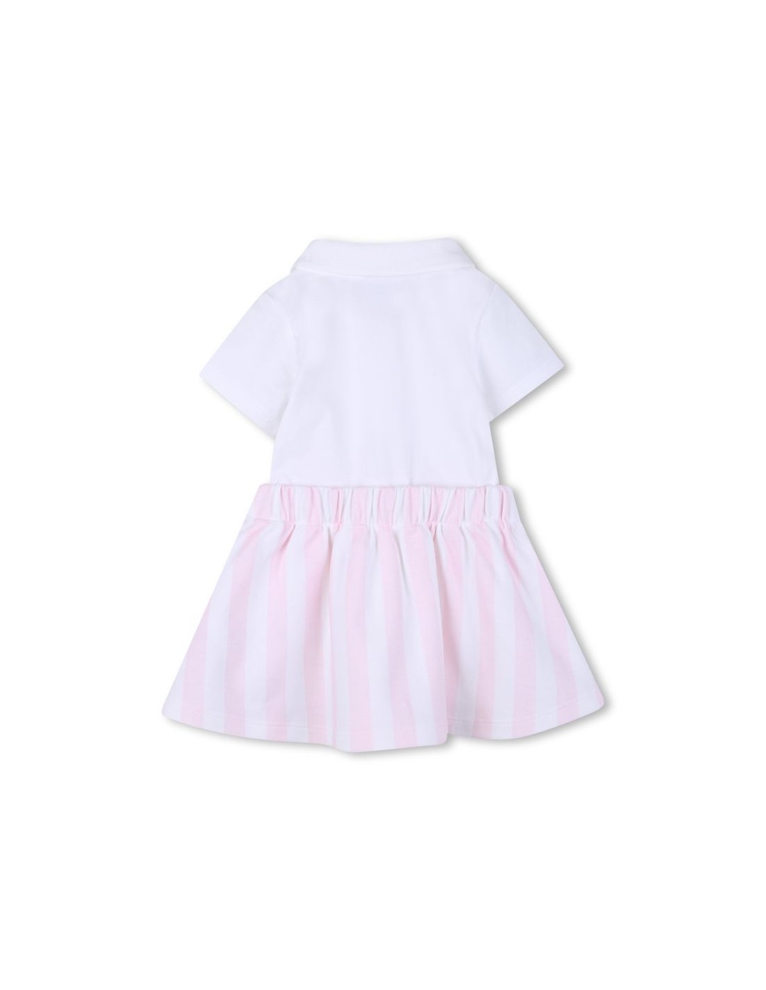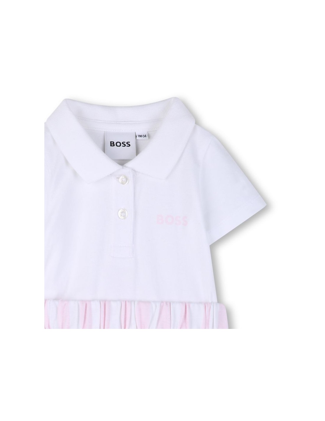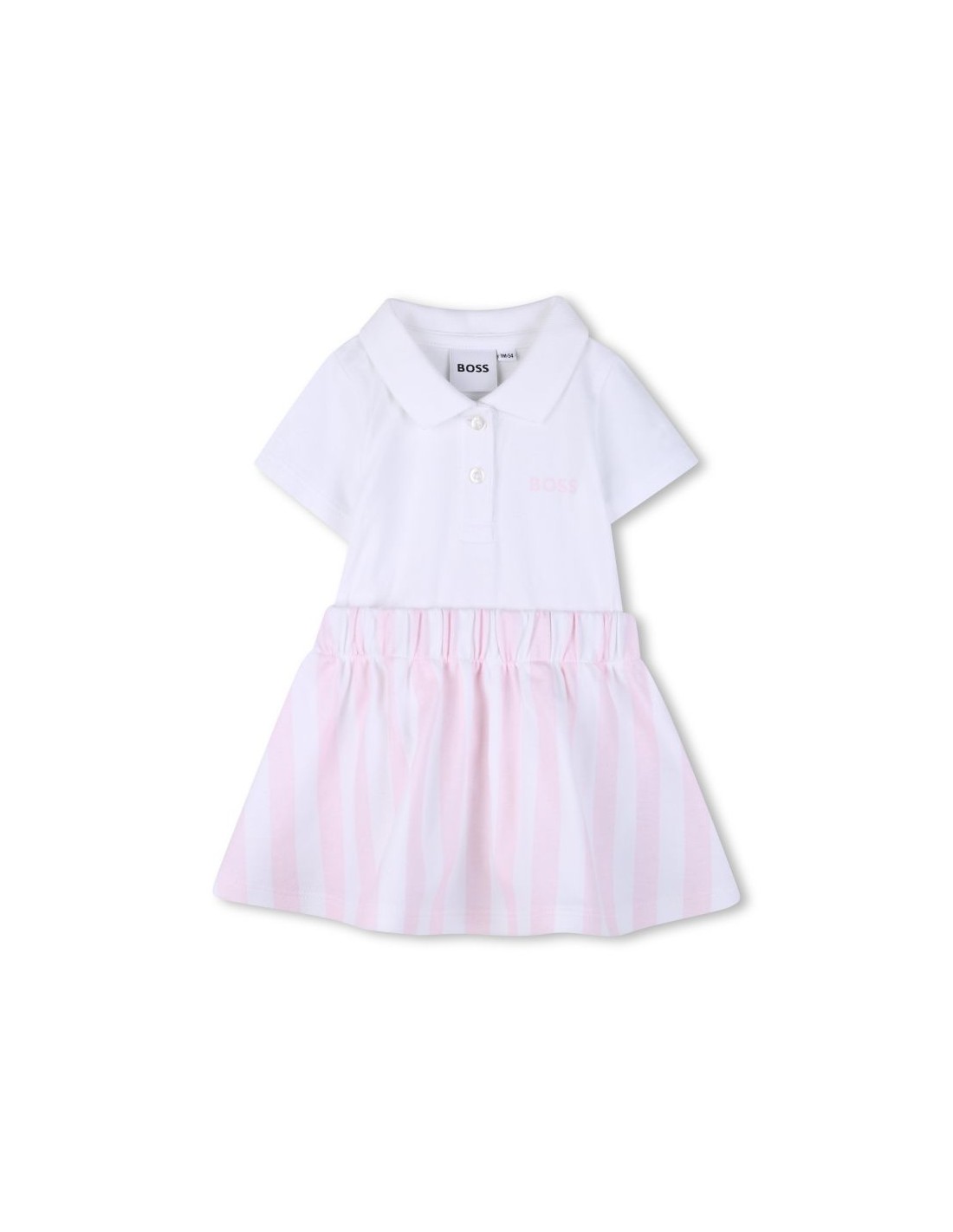 Entre no mundo da moda infantil com este vestido BOSS, que combina conforto e elegância. A parte superior de algodão e elastano oferece um ajuste clássico, com um elegante fecho de botão na gola. A saia apresenta listas elegantes.