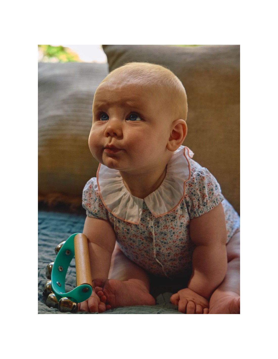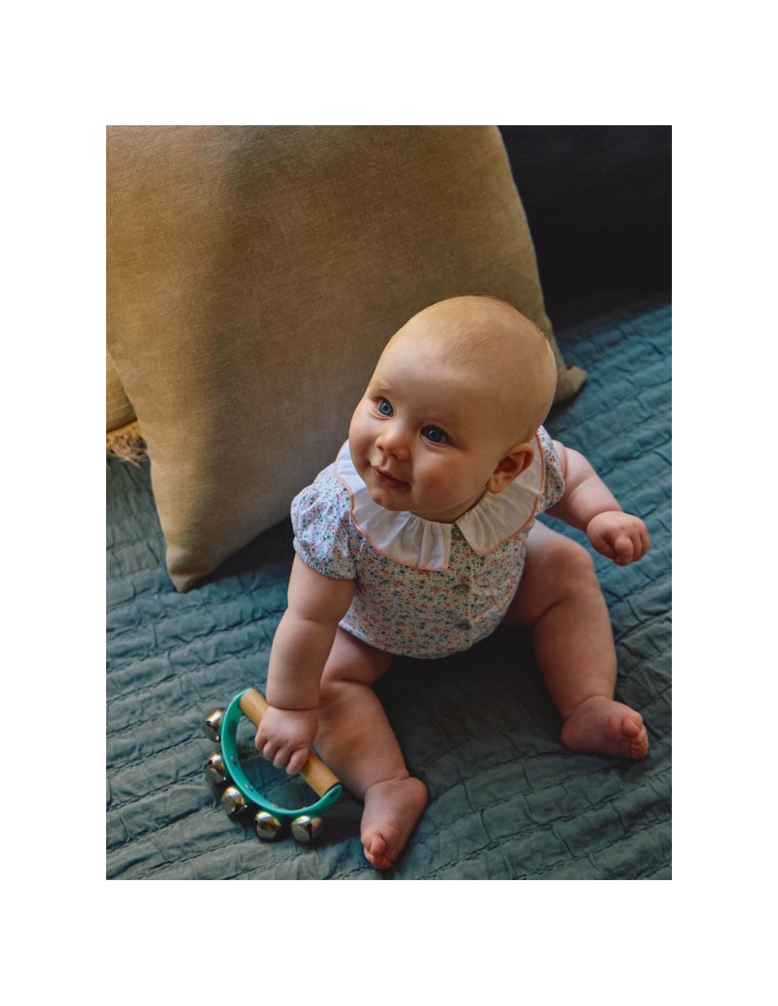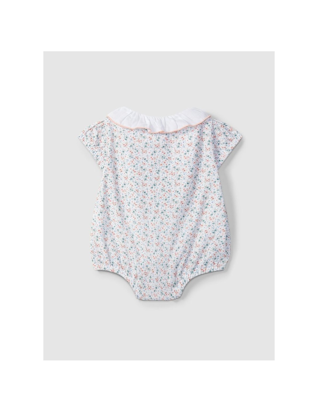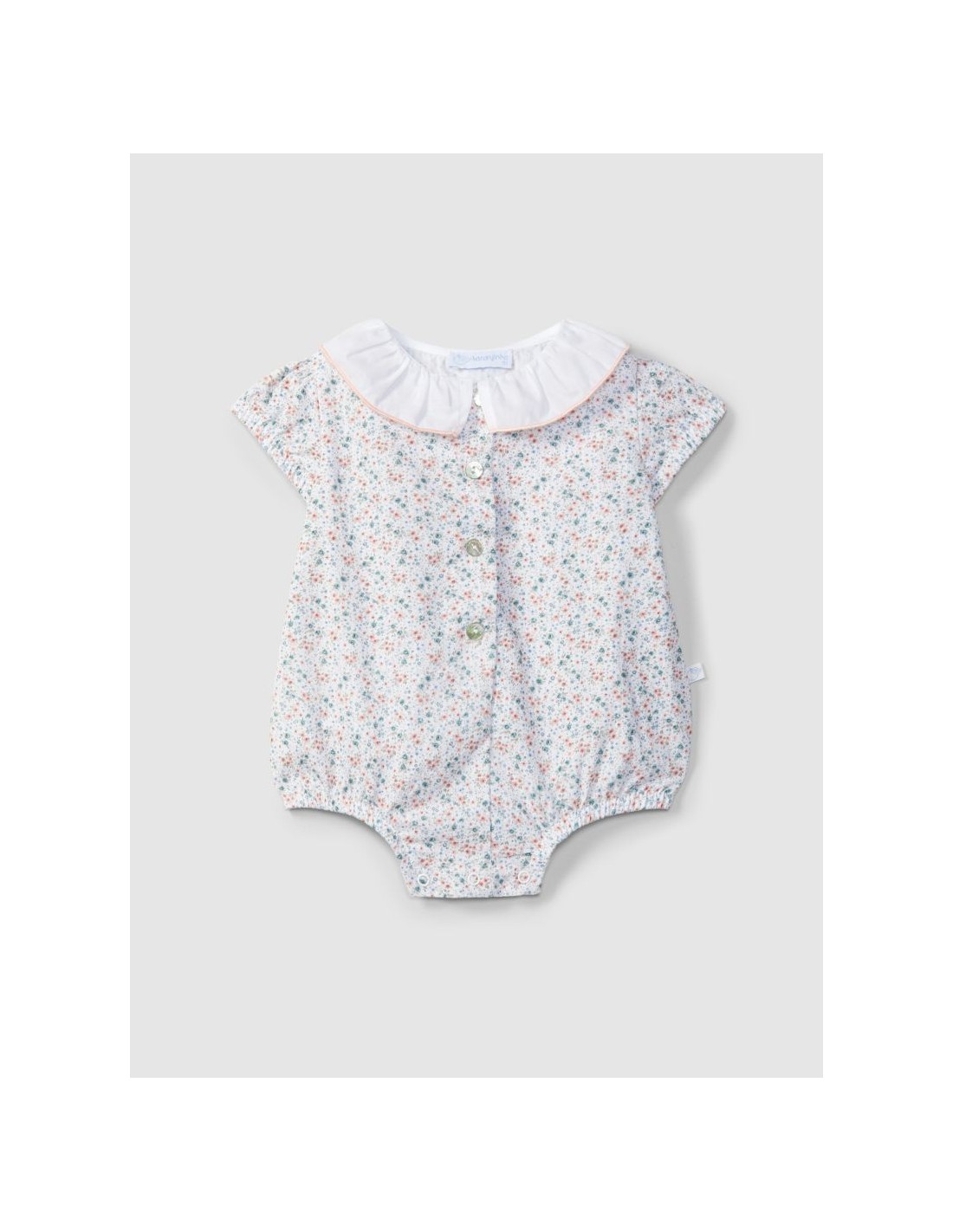 Fofo em tecido, 100% algodão seersucker estampado de flores. Gola de folho em tecido liso com detalhe de rolinho em cor contraste. Aperta com botões madrepérola Laranjinha na frente e molas no entrepernas.