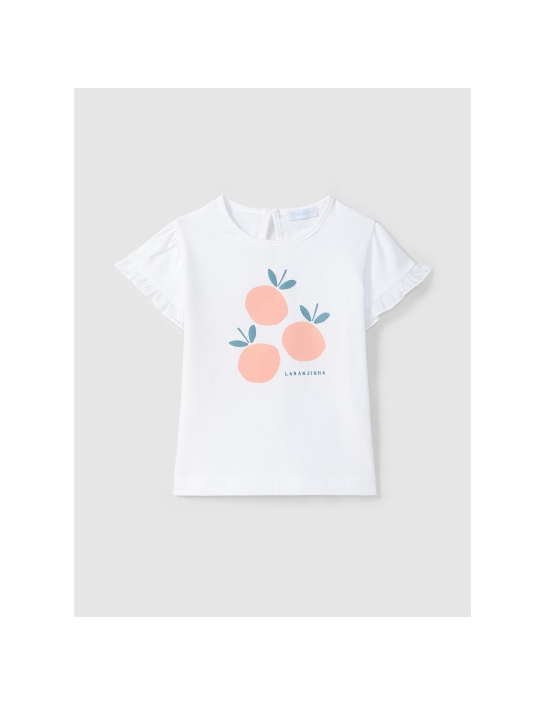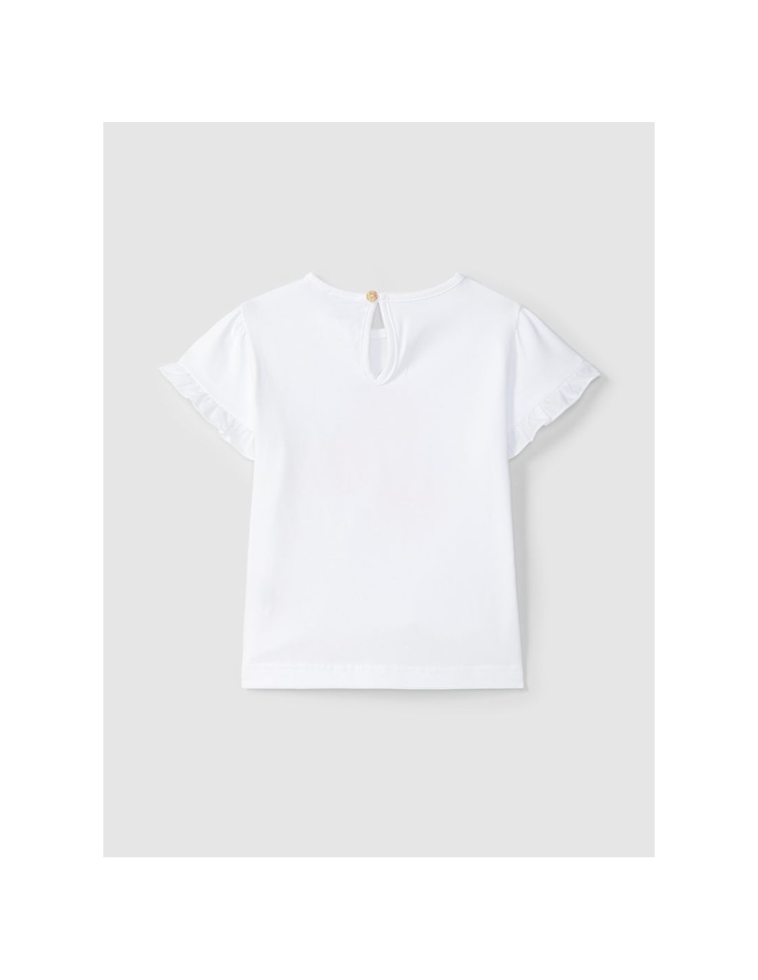 T-shirt em malha de algodão com estampado e detalhes em relevo. Folho nas mangas em tecido. Abertura em lágrima nas costas.