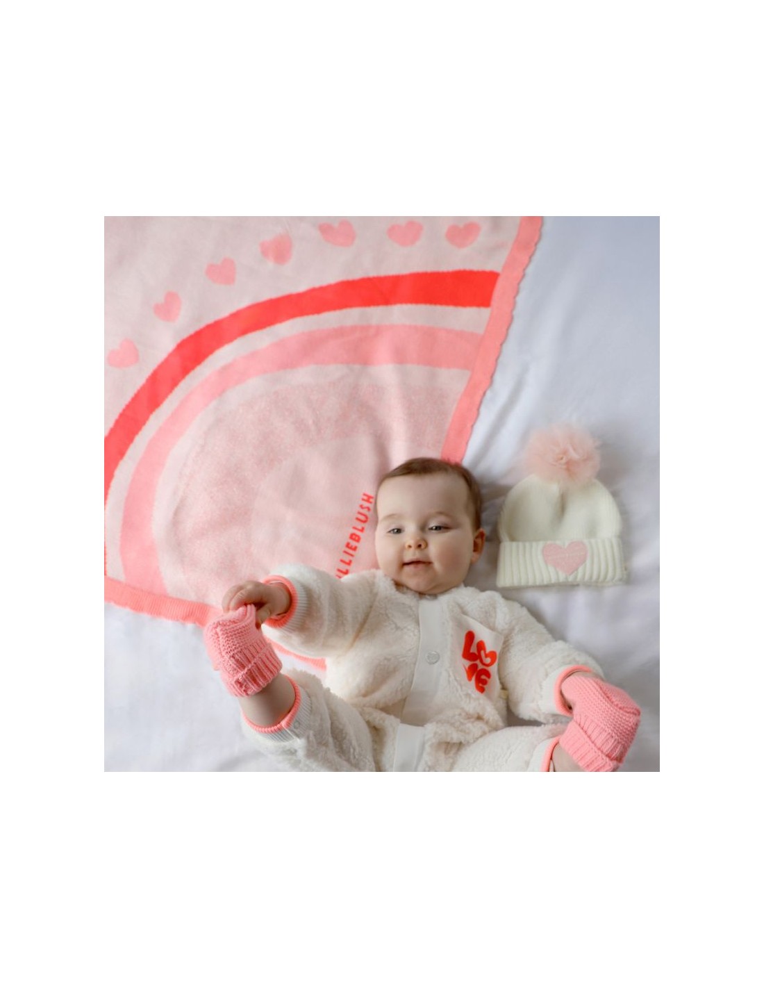 Esta manta tricotada da BILLIEBLUSH envolve as crianças em suavidade. Adoramos sua ilustração de arco-íris e acabamentos delicados. Um acessório quente e colorido para colocar no carrinho, na cama ou para momentos de carinho.