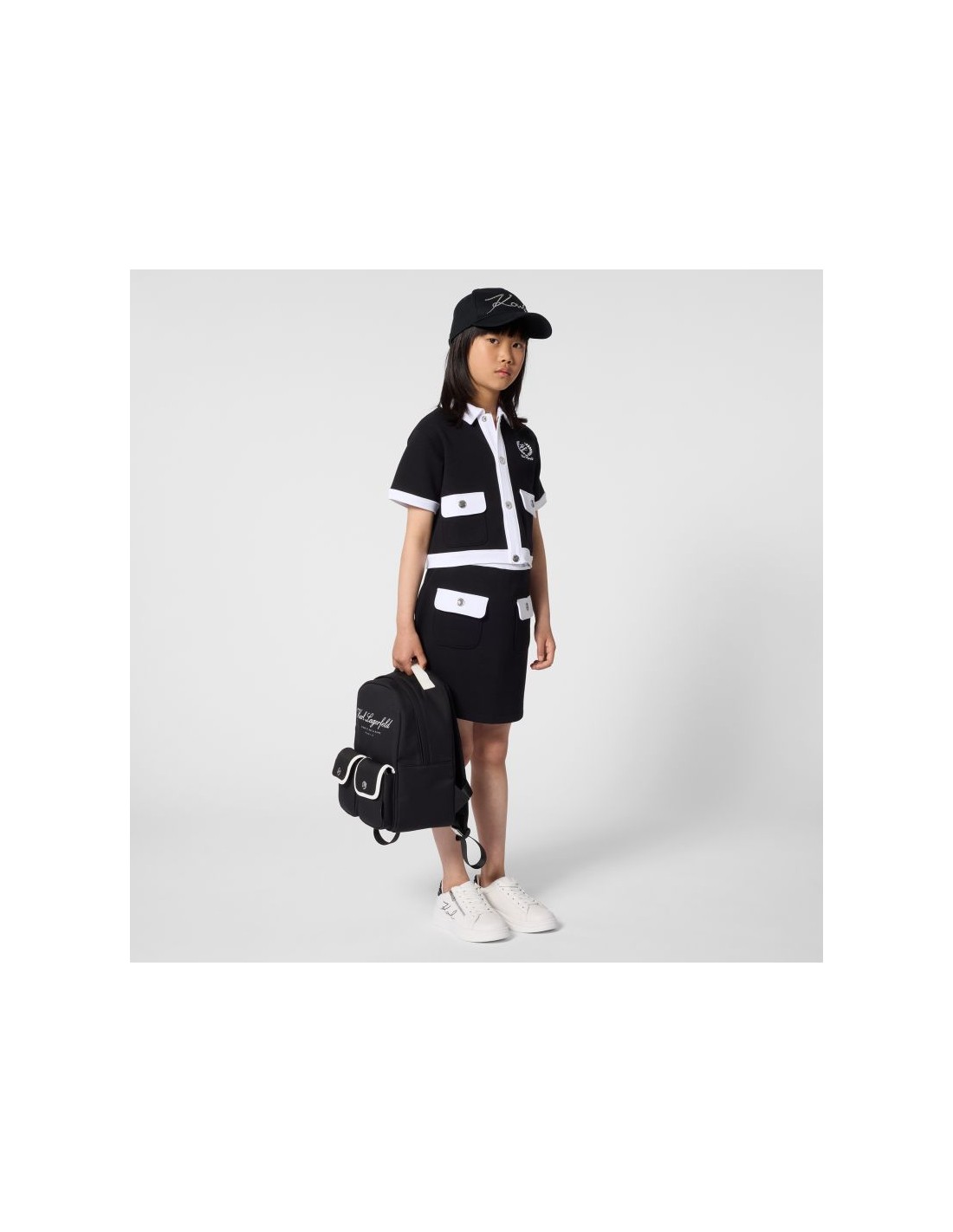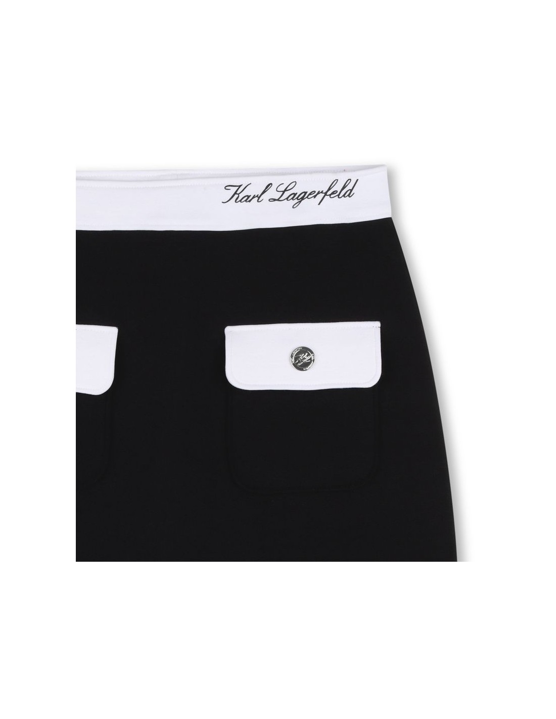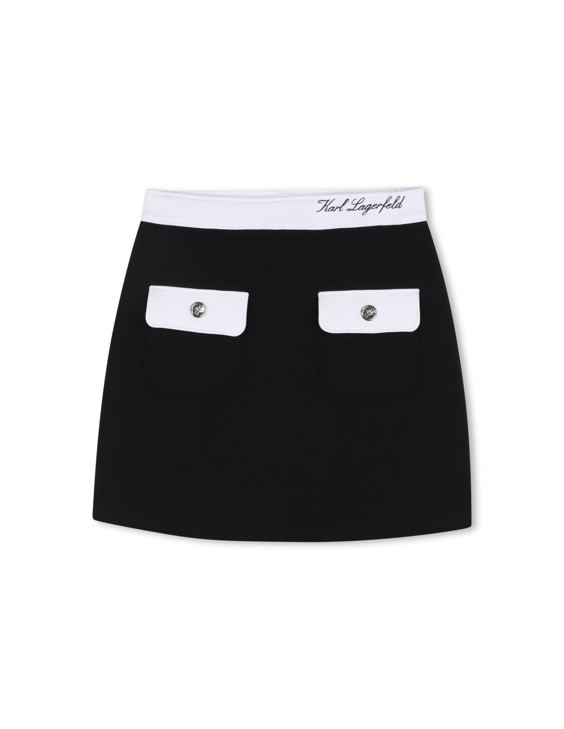 Mergulhe no mundo divertido KARL LAGERFELD KIDS com esta mini saia. Confortável e estilosa, é indispensável! Destaca-se pelos bolsos patch adornados com botões com logo. A icónica ilustração no cinto adiciona um toque sofisticado.