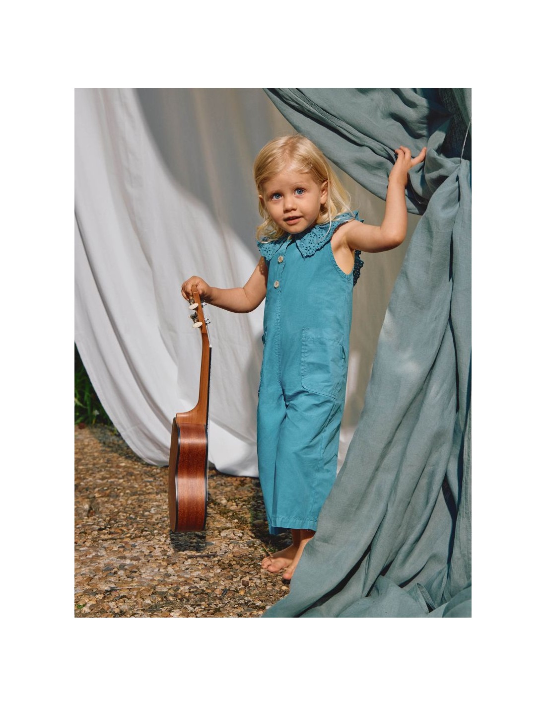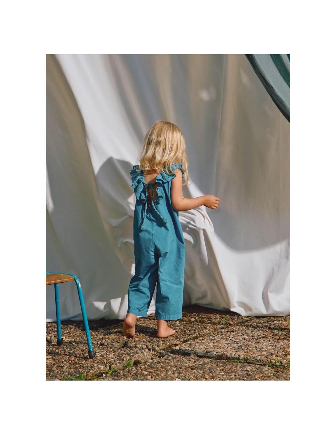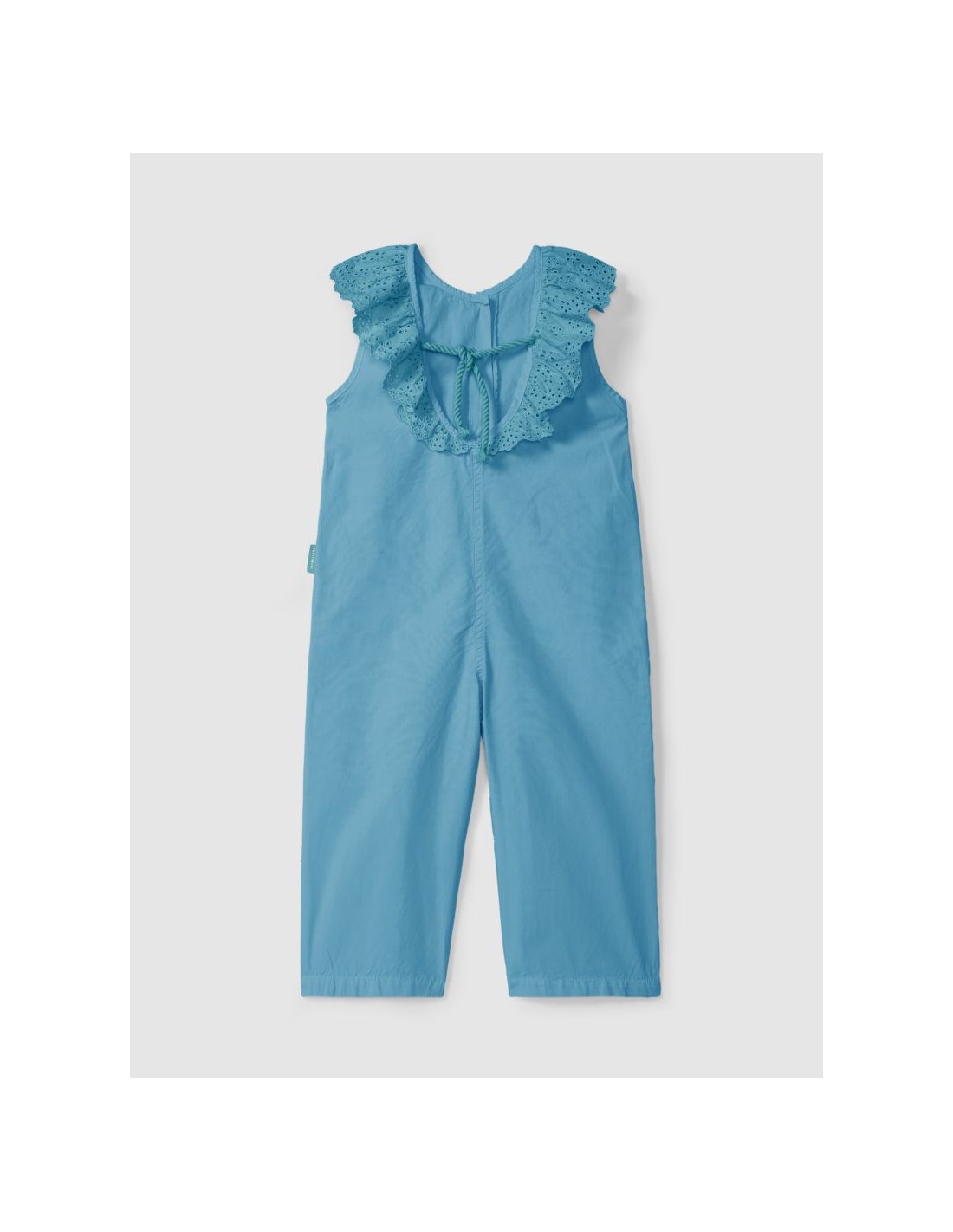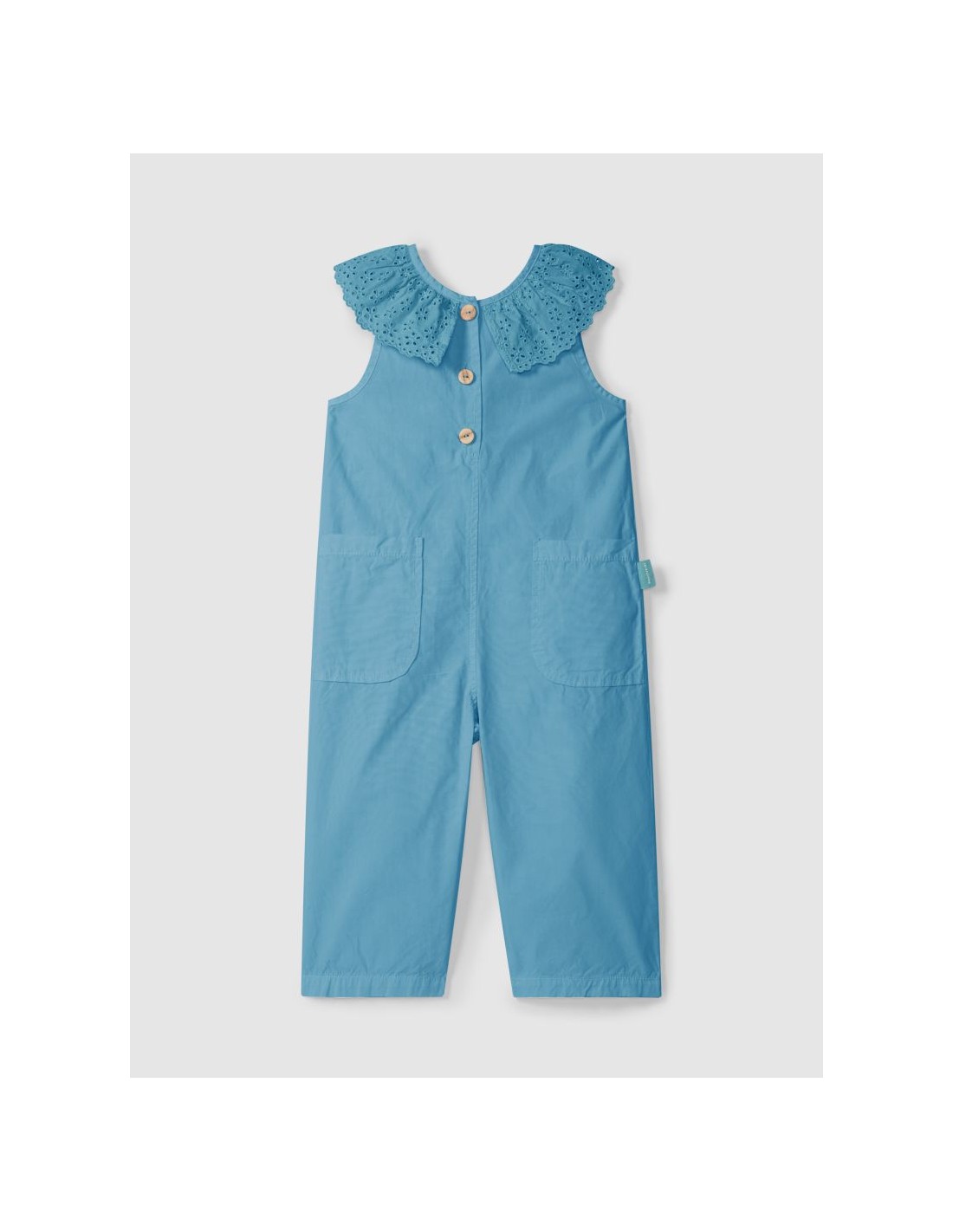 Jardineiras em sarja leve e maleável, 100% algodão, com bolsos funcionais na frente. Gola de folho em bordado inglês e costas abertas com detalhe de cordão. Aperta com botões Laranjinha na frente.