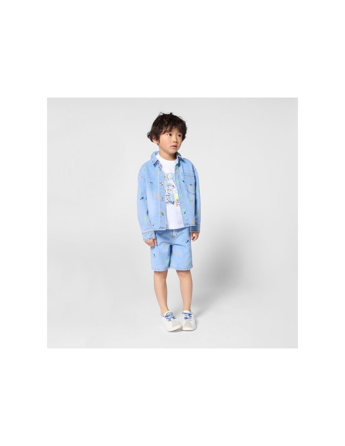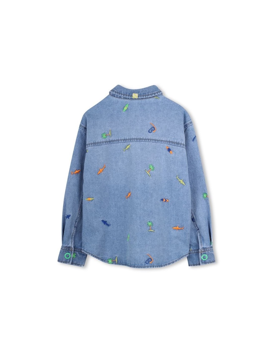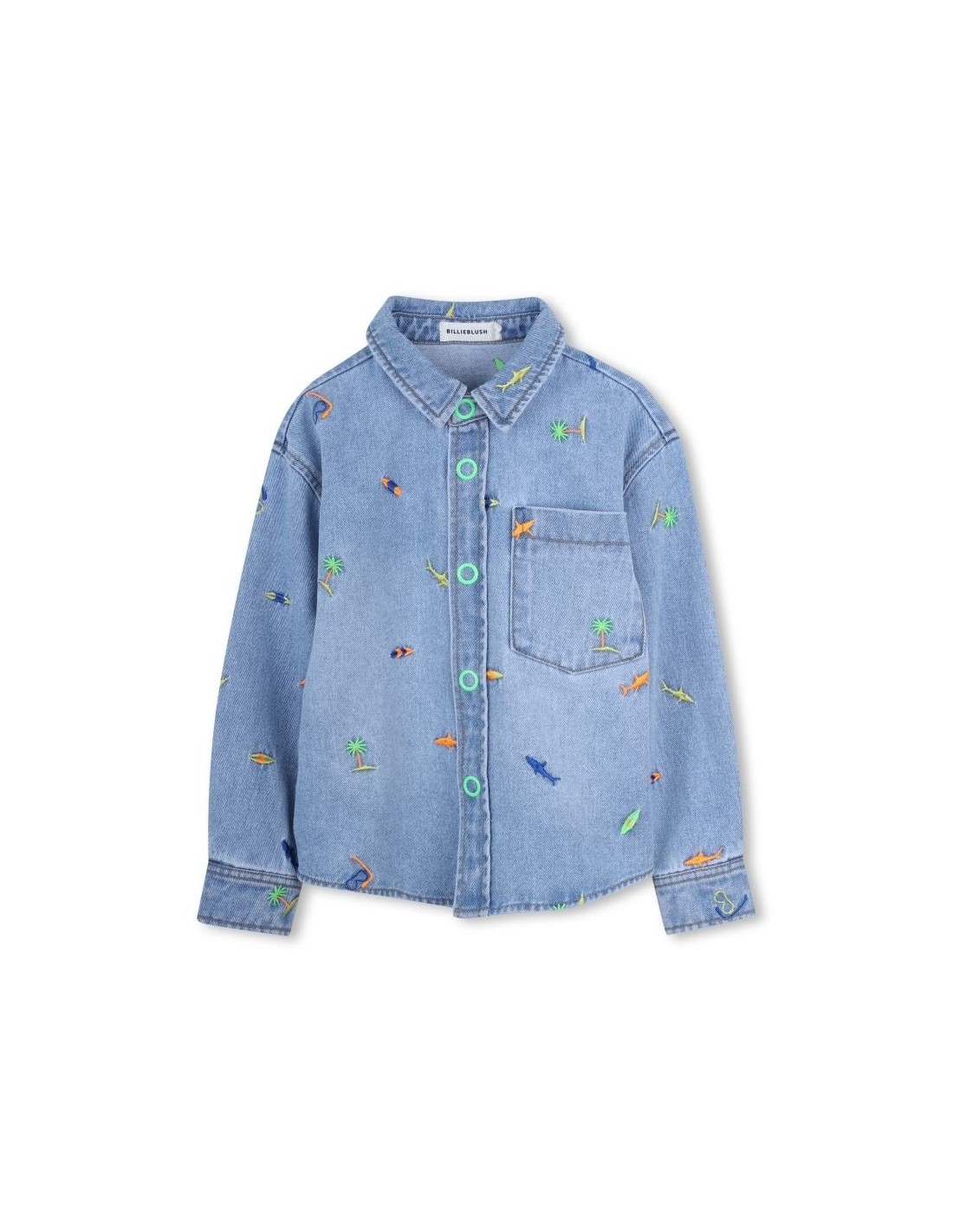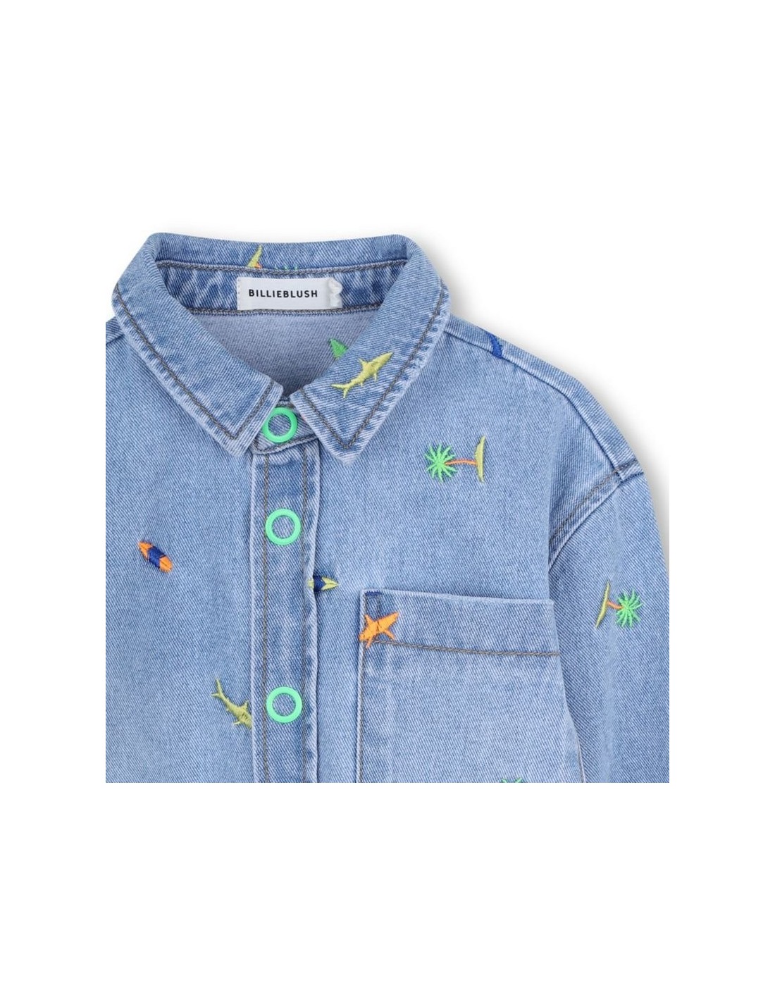 Capitão, deixe o marinheiro divertir-se com esta camisa jeans da BILLIEBLUSH. Tubarões delicadamente bordados dão um toque divertido, enquanto o bolso prático no peito e o fecho de pressão garantem uso fácil no dia a dia.